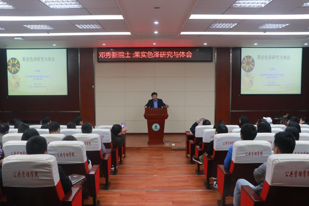 12月14日晚,中国工程院院士邓秀新做客我校公共管理论坛,在人文楼M115报告厅带来了题为“果实色泽研究与体会”报告,报告由司机会所