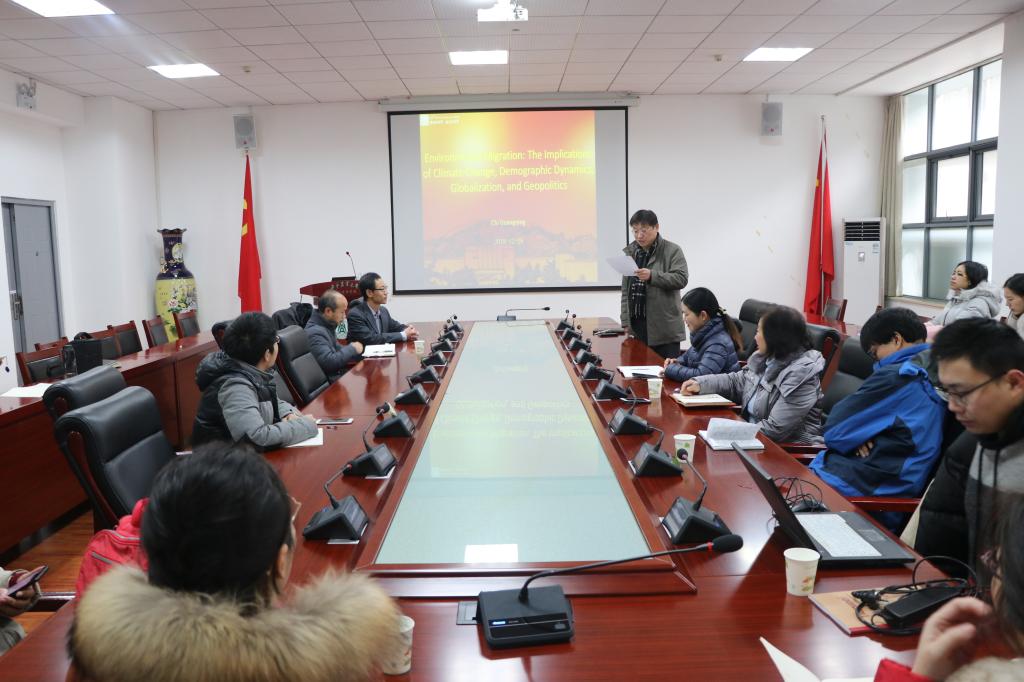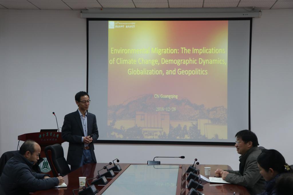 12月28日上午,宾夕法尼亚州立大学农业经济、社会与教育系终身副教授及运算与空间分析部主任迟光清做客我校第114期公共管理论坛,在人文社科楼M101为全体师生带来题为“Environmental Migration: The Implication of Climate Change, Demographic Dynamics, Globalization, and Geopolitics”的报告,详细地介绍了美国优越自然环境驱动下移民状况的研究。本次报告会由司机会所