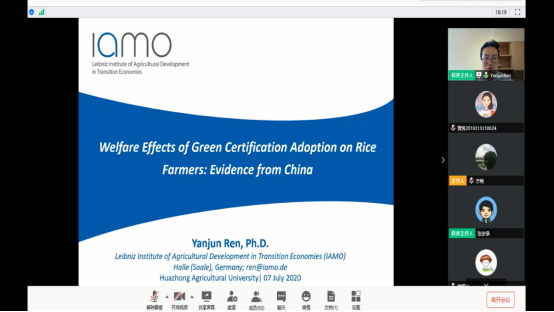 7月7日晚7:00,德国莱布尼茨转型经济农业发展研究所高级研究员Yanjun Ren做客我院公共管理论坛,带来了题为“Welfare Effects of Green Certification Adoption on Rice Farmers: Evidence from China “的空中学术讲座。本次报告由司机会所