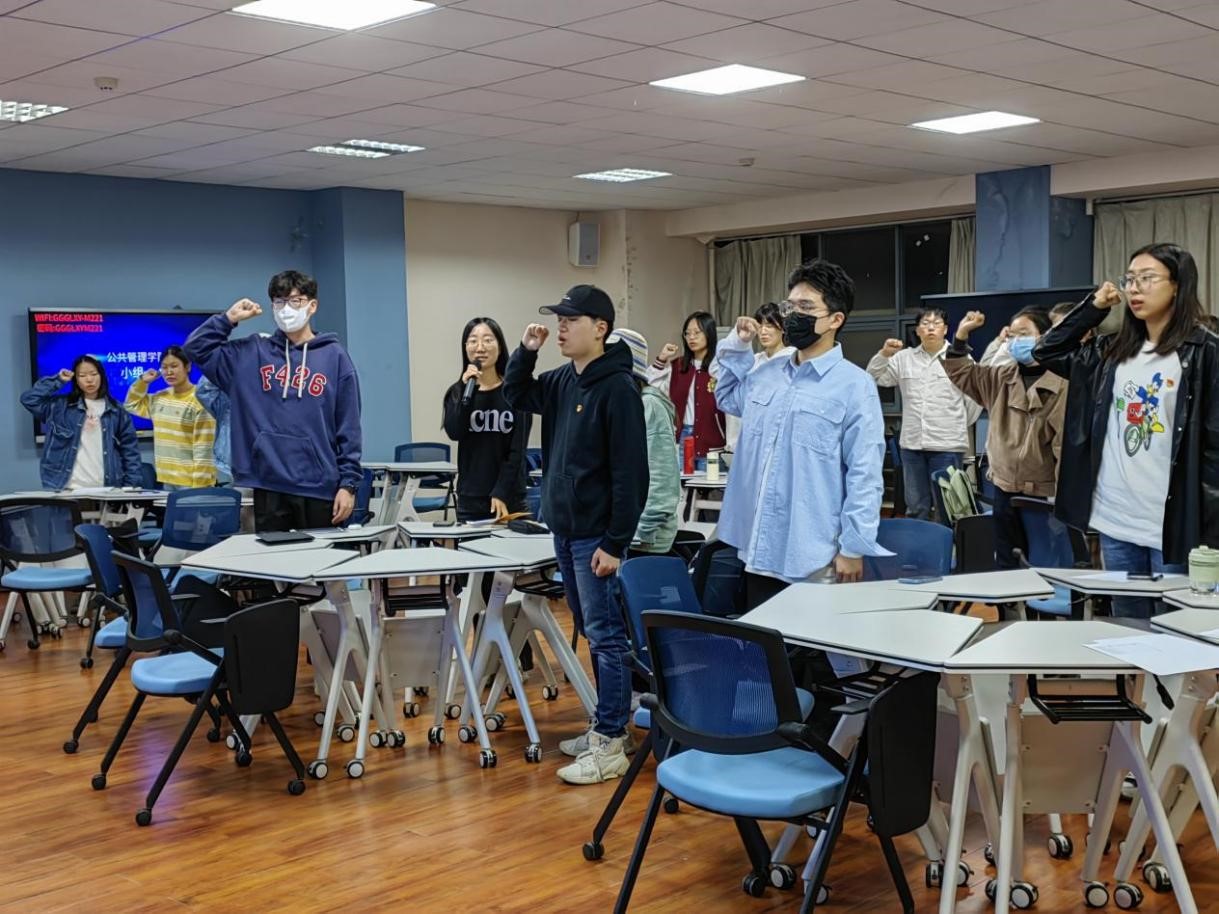 信管2001班的廖雯菁紧扣“时代感”关键词,引领同学们感悟新时代、建功新时代。激昂动听的《时代感》不仅是公管院老师们工间操的必跳曲目、我校第一届健康活力大赛的开场节目,也是2022年央视春晚的表演歌曲。“不同人、不同阶段唱响的‘时代感’都有不同风范,但实现中华民族伟大复兴的中国梦是我们共同的、必不可少的时代感”,廖雯菁带领同学们潜心思考,一同探索二十大之后又将萌发怎样的新时代感。