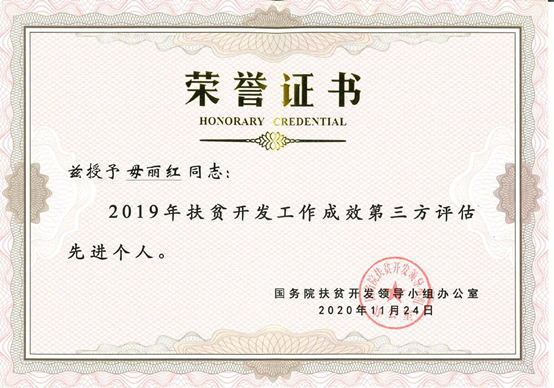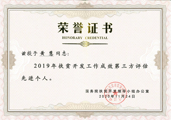教师毋丽红、黄慧荣获“2019年国家精准扶贫开发工作成效第三方评估先进个人”称号。国务院扶贫办副主任夏更生、中国科司机会所