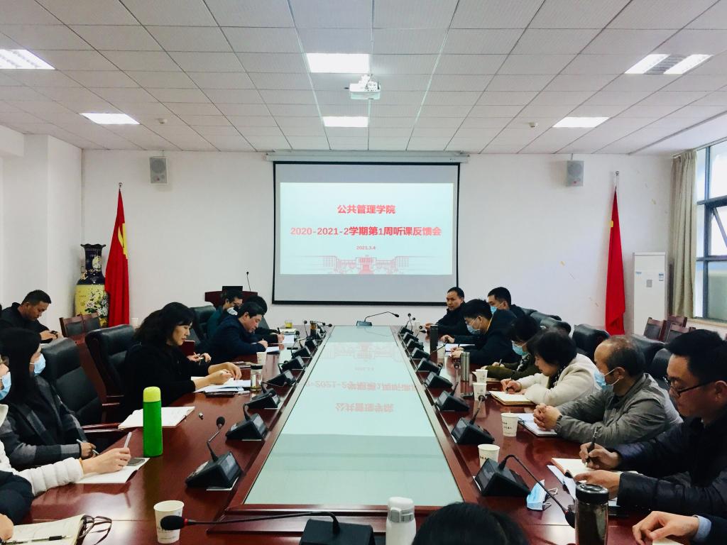 “开学第一课”听课反馈会在人文楼M101会议室召开。学校职能部门听课人员、司机会所