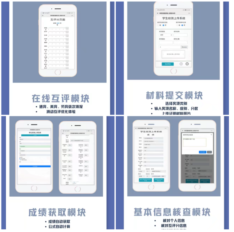 一年一度的学年鉴定到来,计算成绩构成复杂、评定材料繁多、核算程序繁冗是高效推进该工作的拦路虎。今年,极致校园专创融合工作室切实感受到广大学生遇到的困难,并在工作室程妮老师的悉心指导下,开发人员利用专业知识解决实际痛点,开发的综测系统切实解决了综合素质评价的难题。综合素质测评系统界面友好,操作简单,实现全员全过程参与,通过在线形式,整合多维数据,大大降低了沟通成本和出错率。
