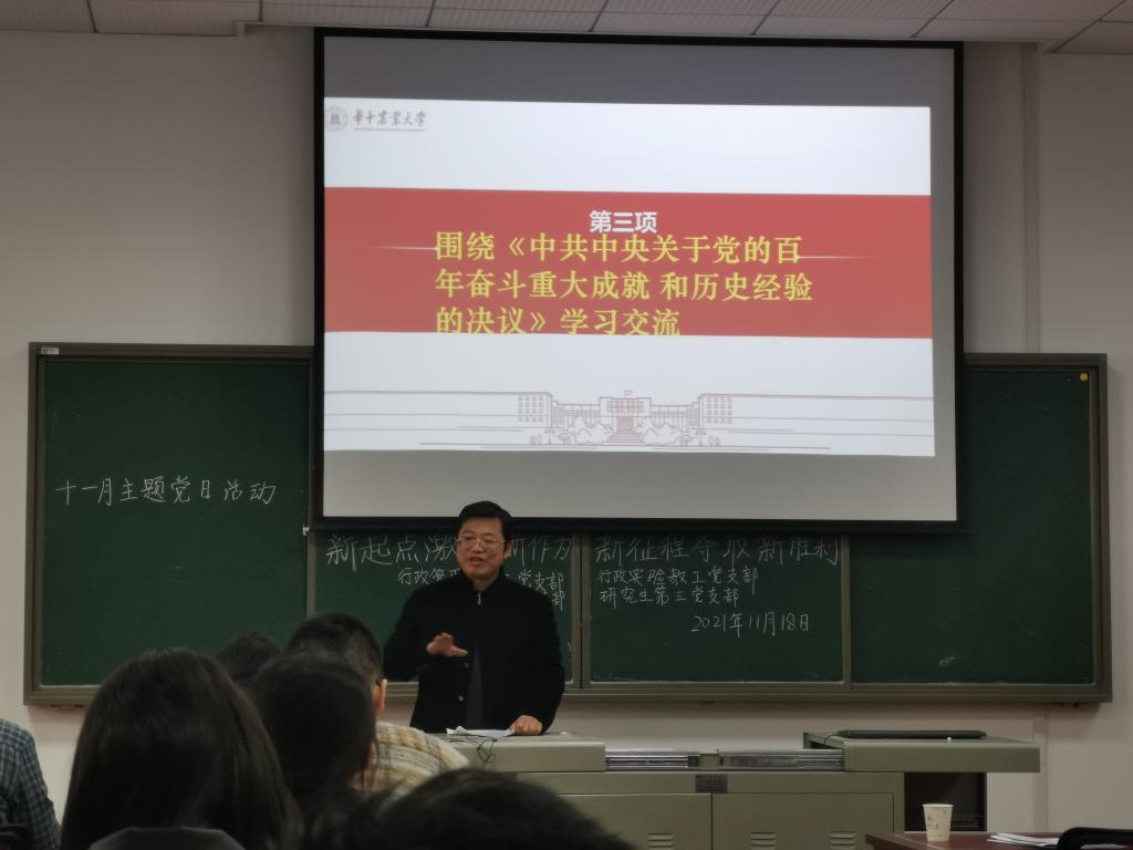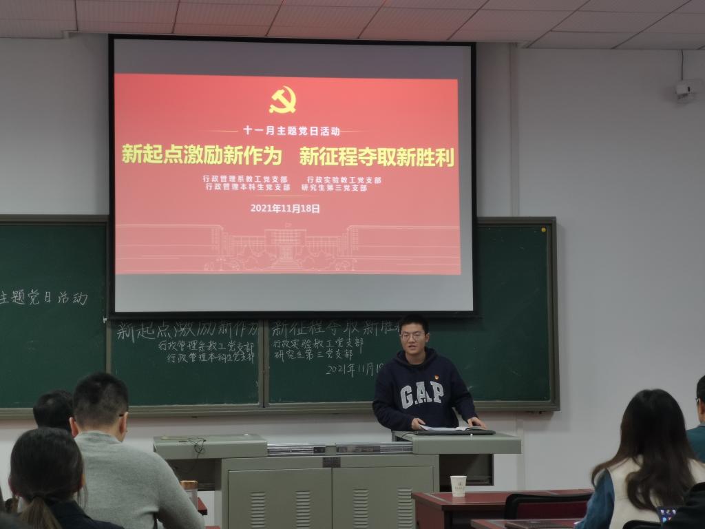 11月18日下午,行政教工实验党支部、行政管理系教工党支部、研究生第三党支部、行政管理本科生党支部联建对接,于人文楼113召开11月份主题党日活动——“新起点激励新作为,新征程夺取新胜利”。会议由行政管理本科生党支部书记张薇主持。