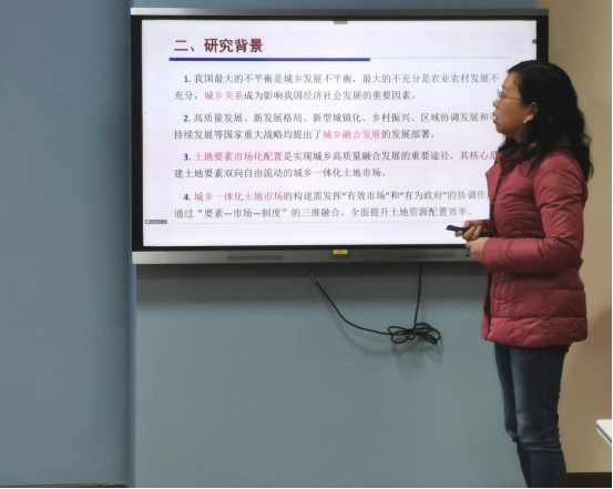 彭开丽从研究选题、研究背景、研究意义、研究内容、可能创新和科学属性等方面汇报了选题与研究思路。陈银蓉老师认为该研究思路较为清晰、框架搭建较为完整,但也对“土地要素双向自由流动”和“破除制度和政策障碍”两部分的研究提出了亟待改进意见。柯新利老师认为该选题较为完善,选题意义复合现实需要,但项目工作量相对较大,建议基于现有研究来对选题进行聚焦并集中突破。姜庆志老师和杨嬛老师分别对研究内容的行文逻辑与技巧、选题和研究范围提出疑惑,柯新利老师和彭开丽老师则给出了相应回答,最终他们在研究应当具体、论文各部分应要清晰等方面达成共识。