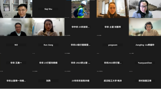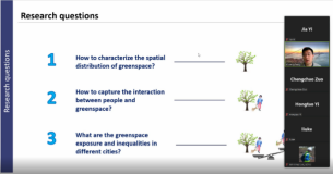 陈焕发副教授和我校左成超副教授担任主持人。阿姆斯特丹自由大学Žiga Malek助理教授分享了中国 2035 年生物多样性和生态系统对话计划对土地利用的影响研究。格拉斯哥大学赵群山副教授应用非流体动力学模拟模型评估了树木影响下的现场热应力并获得最佳的树木布局。佛罗里达州立大学易洪涛教授通过回答“地方政府为什么要签订地方间环境协定?”和“地方管理者在地方间环境协议形成过程中扮演什么角色?”两个问题向大家介绍了变革推动者和地方间合作的相关内容。耶鲁大学博士后Yimeng Song以“Greenspace exposure and inequality in urban China”为题,解答了“如何描述绿地空间的空间分布特征?”“如何捕捉人与绿地之间的互动?”“不同城市的绿地覆盖率和不平等情况如何?”三个问题。此外,浙江财经大学专职研究员、林肯大学孙晔然副教授和约克大学Sohail Ahamd助理教授分别介绍了耕地系统变化对粮食生产和碳预算的影响、城市化背景下日间人口分布以及非洲和亚洲的城市土地利用效率,博士柳可和张悦也分别对城市扩张与耕地生态补偿效率的时空相关性和中国土地利用碳排放的空间关联网络及其驱动因素进行了研究。
