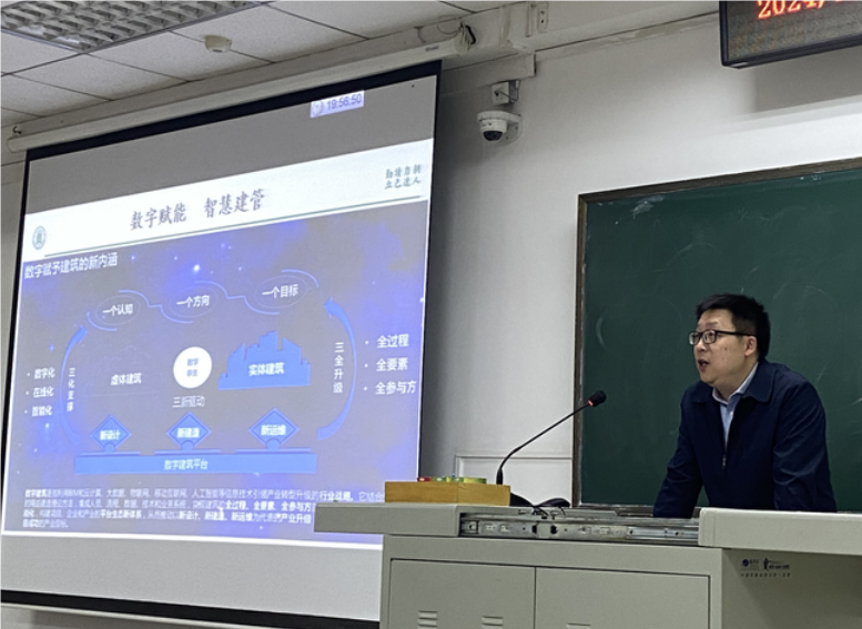 工程管理系主任周义老师以“数智赋能精‘工’智‘管’新视野”为题,从历史和国家角度剖析了工程建设行业的发展历程,表达了对工程建设行业的信心,并从国家和城市群等多个方面呈现了工程管理专业的光明前景。他引用习近平总书记讲话“城市建设,要让居民望得见山,看得见水;让城市留下记忆,让人们记住乡愁。”,并通过“千城一面”与“特色和谐”的对比,勉励同学们响应国家的号召,在产业深度转型、总量与增速双降、需求与支柱地位依然巩固的社会背景下善观大势、常思大局、独立思考,在广阔的职业发展空间中创出自己的一片天地。