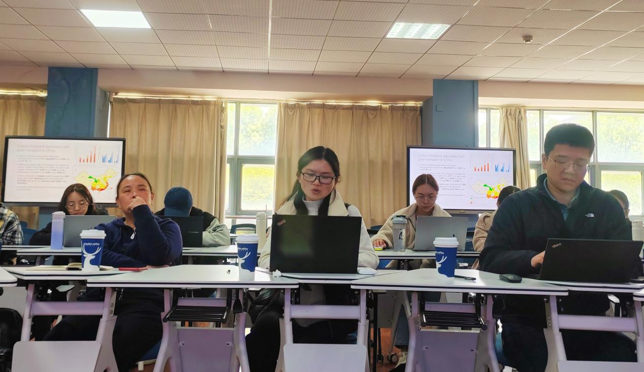 参会师生聚焦该研究的相关指标选取、数理模型分析、未来研究方向等方面进行了积极讨论。何利杰老师对需求量的计算和获取问题进行交流,并谈到该研究成果对如何优化我国耕地的空间布局具有一定的启发性。杨帆老师关注到研究中耕地位移贡献1990-2015年谷物运输碳排放增加量的比例为60%,针对如何将其他影响因素进行剥离的数理方法开展讨论。胡小芳老师指出迁移后的人口集聚程度和碳排放量的内在联系可作为进一步研究方向。