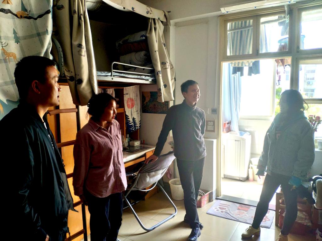 本科生辅导员吴晗、徐冠博、张薇和兼职辅导员一行深入学生寝室开展安全文明卫生突击检查,了解学生学习生活情况,强调学生寝室安全文明卫生创建。