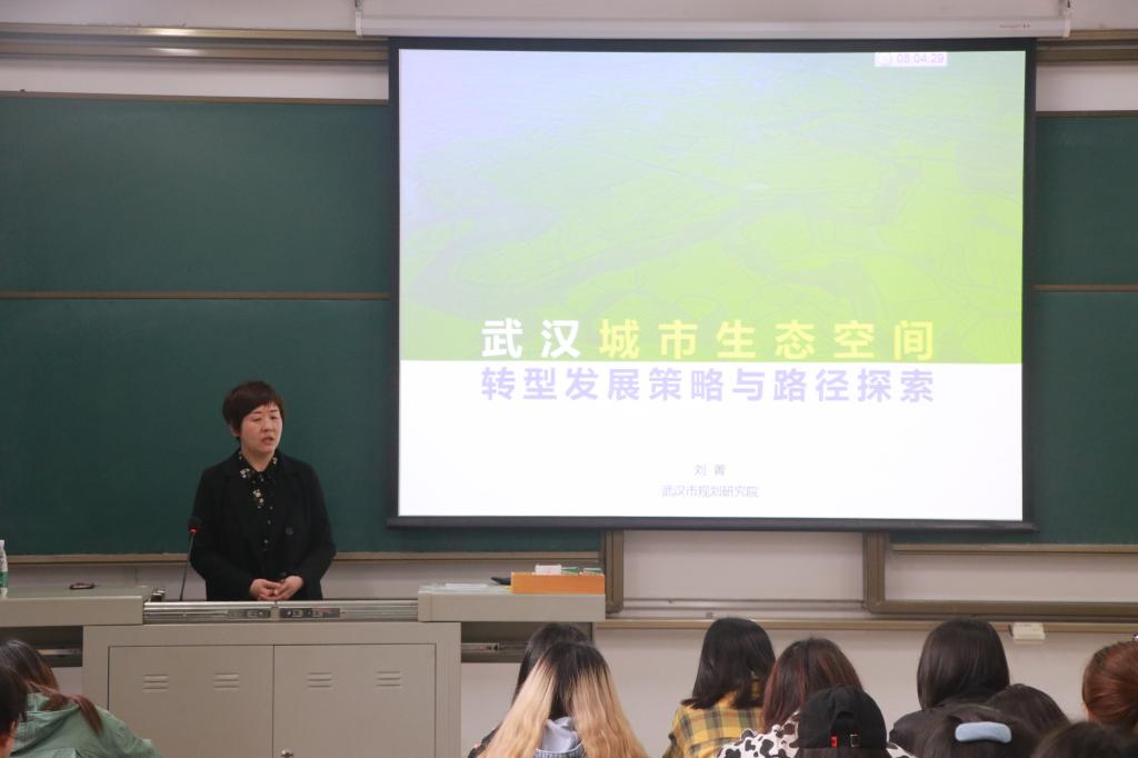 《土地利用规划》课程在第四教学楼410教室迎来了别开生面的“创新课堂”。课程负责教师蔡银莺邀请到武汉市规划研究院规划设计二所,有着丰富城市规划、城市设计、景观设计、功能区规划经验的刘菁主任,为2018级土地资源管理专业的本科生带来题为“武汉城市生态空间转型发展策略与路径探索”的主题报告。
