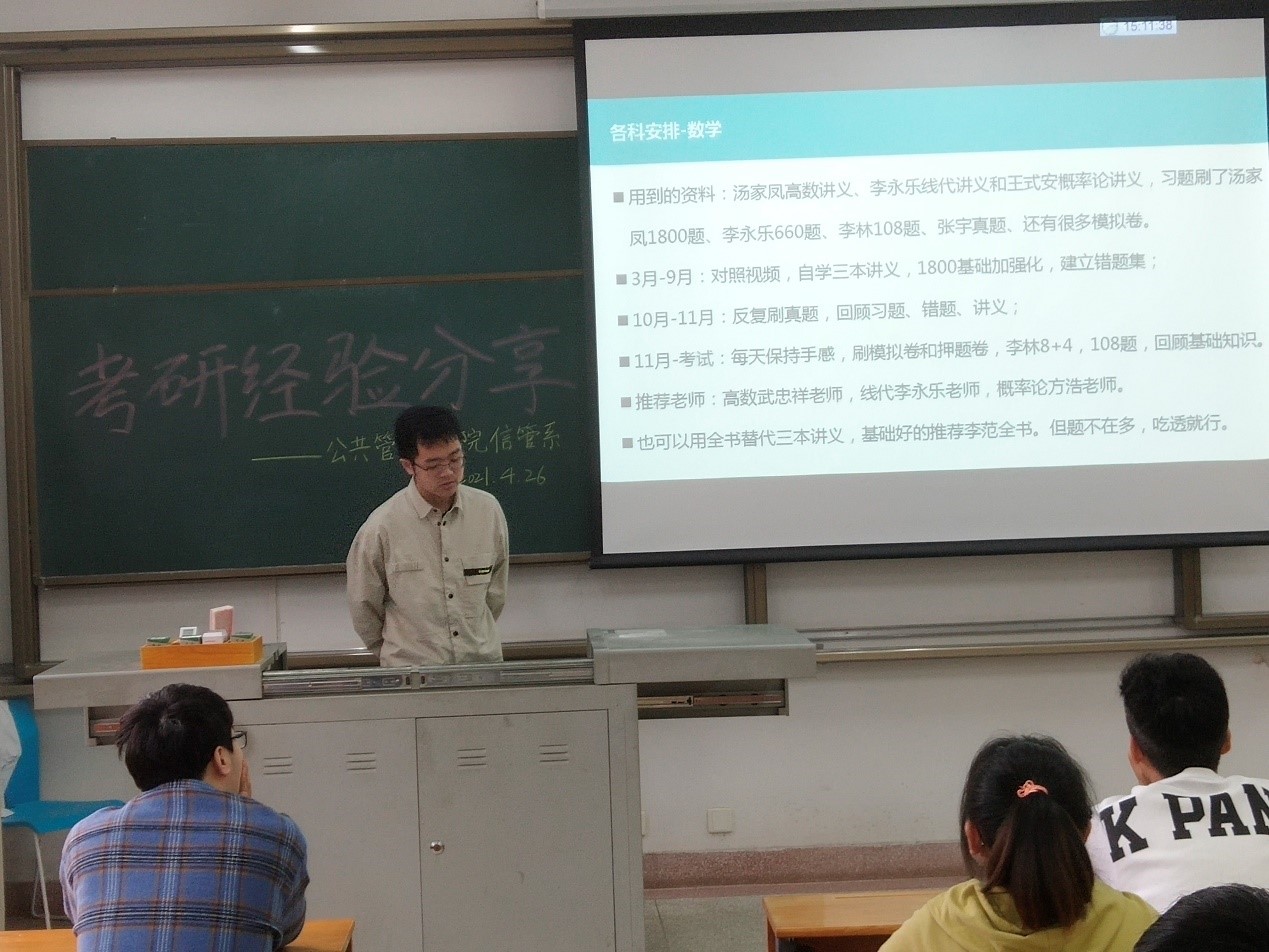 信管系18级本科生在四教C104举办了一场考研经验分享会,此次分享会邀请17级本科生王泽奇,王若璇,彭伟,仝蕊蕊和王家辉为18级学弟学妹分享考研经验与心得。