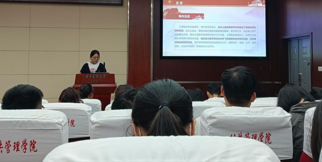 行管党支部祝毓阳同志从坚持推进常态化疫情防控与“3·21”东航MU5735航空器飞行事故入手,就坚定维护国家安全展开了详细的论述。人力本科生党支部任汉铖同志发表了自己对严守安全底线大学生如何尽自己之能的看法。