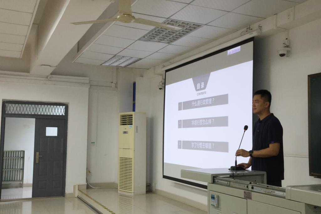 姜庆志向同学们介绍了行政管理专业的相关内容。他从三个方面入手,分别是“行管的定义与背景”、“华农行管的优势”和“行管专业的就业方向”,让同学们更深入地了解行政管理专业的特点和前景。姜庆志表示:“虽然华农的行政管理专业是比较年轻的专业,但它具有很大的发展潜力。”随后,他回答了同学们对行政管理专业的疑惑,包括人才培养方案的细节等。他也祝愿同学们能够进入自己心仪的专业,茁壮成长。
