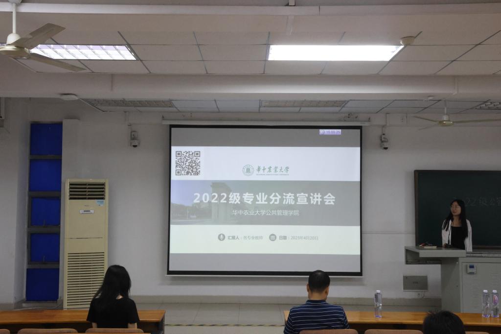 于三教B205召开2022级专业分流宣讲会,由工程管理系王歌、信息管理系李优柱、行政管理系姜庆志、土地资源管理系曾晨主讲,全体2022级学生参与。