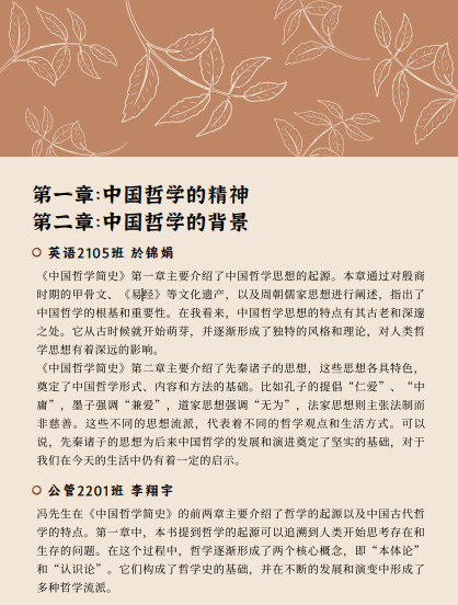 公管2201刘佳衡和管科2202陈可等也谈及了儒、道、墨、法等哲学流派的不同之处,以及人怎样才为“人”的具体观点。他们普遍认识到了哲学思想对个人成长的指引作用,也了解到了中西方哲学传统对文化及人类世界解释的不同侧重点。今后他们会继续深刻领会哲学思想,感悟时代脉络。