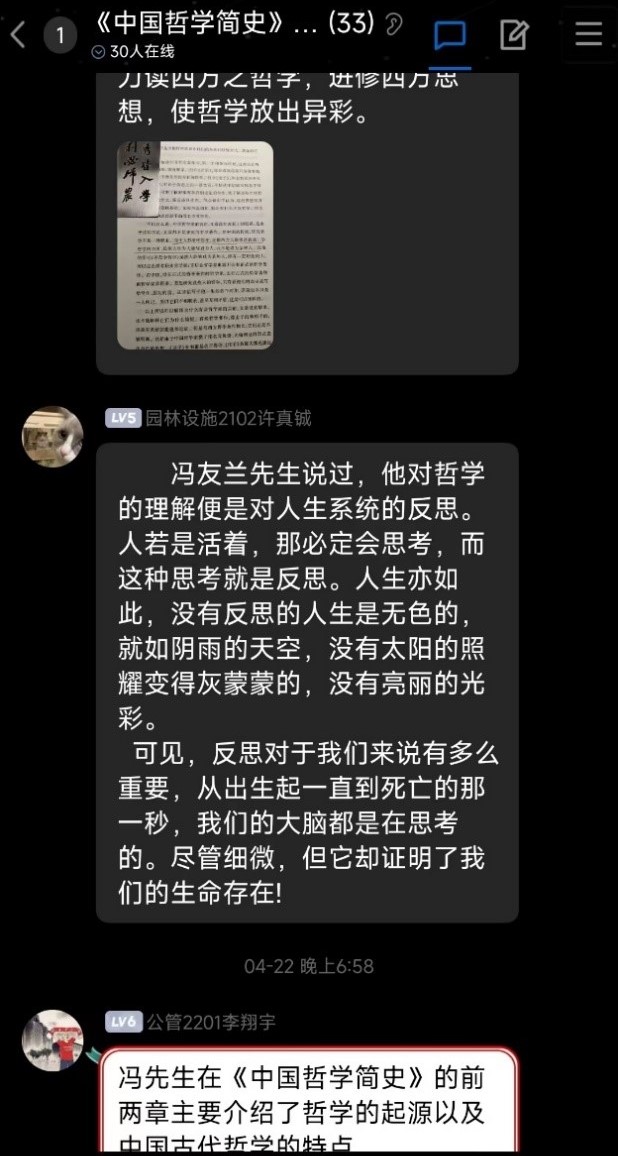 《中国哲学简史》是中国现代著名哲学家冯友兰所著,这部经典之作全面系统地梳理了中国哲学的发展脉络,呈现了中华文化的深厚历史记忆和精神传承。在组建阅读兴趣小组群后,30余名师生进行了为期1个月的线上阅读,从先秦儒家的孔子、孟子、荀子到新儒家的程朱、陆王,从道家的杨朱、老子、庄子到新道家等,同学们积极在QQ群中发表自己的读书感悟。周向阳也在线上积极与同学们交流读书心得,他表示读冯友兰先生的《中国哲学简史》,其目的不能停留于知识的获取,更重要的是从中汲取人生智慧,在生命实践中感悟人生的境界。
