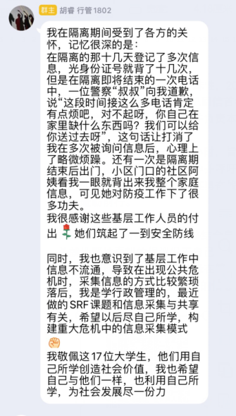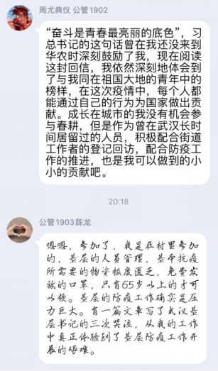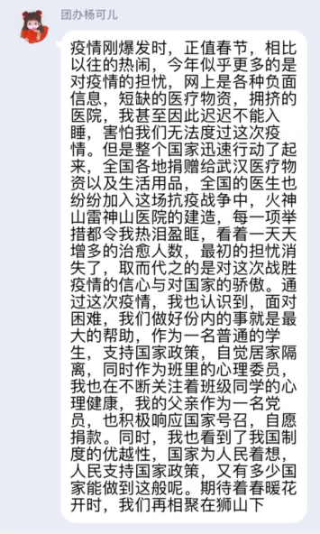 其中,理研会会员们结合自身在疫情期间的所见所闻、参与的志愿活动以及我校有关就地帮扶春耕的倡议发表自己的收获与感悟,深刻地感受到了那些冲锋在第一线的基层工作人员与医护人员的巨大努力与巨大牺牲,也更加坚定了打赢这场战”疫“的信心。
